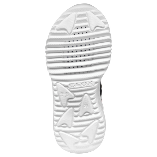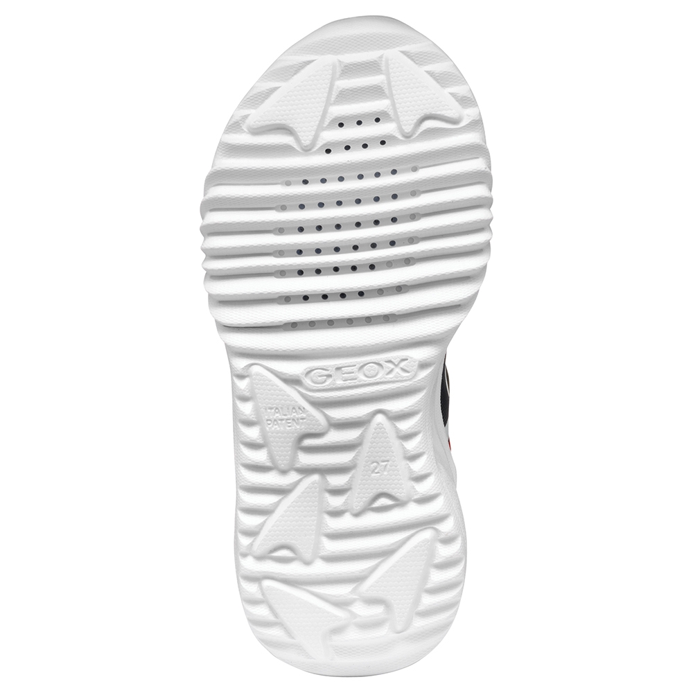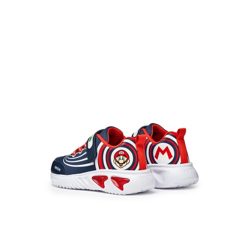 Zapatillas deportiva para niño amortiguada y transpirable de look dinámico, con luces integradas en la suela. Esta versión de Ciberdron en color azul royal y rojo tiene una decoradación con estampados y aplicaciones 3D. Este modelo, fruto de la colaboración entre Geox y Nintendo, ha sido realizado con malla y material efecto piel y resulta ideal para completar los looks de la escuela y del tiempo libre.