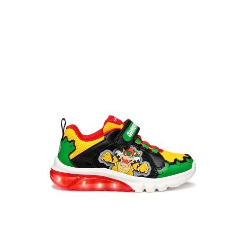 Zapatillas deportiva para niño amortiguada y transpirable de look dinámico, con luces integradas en la suela. Esta versión de Ciberdron en color verde, amarillo, rojo y negro, tiene una decoradación con estampados y aplicaciones 3D. Este modelo, fruto de la colaboración entre Geox y Nintendo, ha sido realizado con malla y material efecto piel y resulta ideal para completar los looks de la escuela y del tiempo libre.