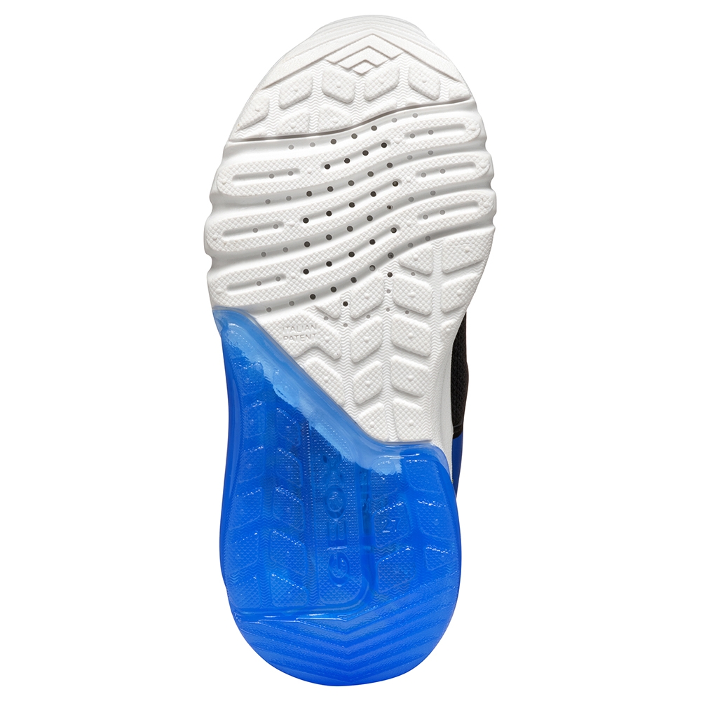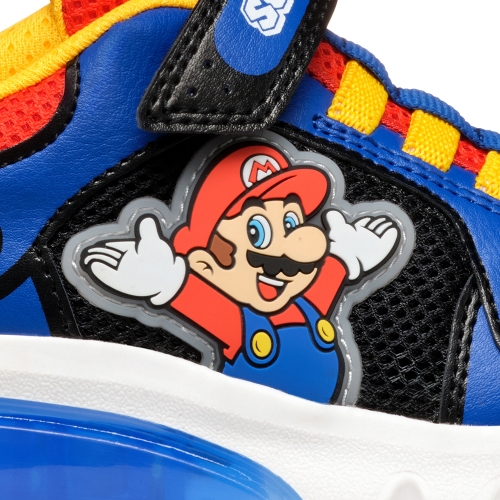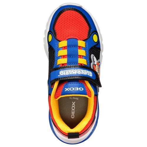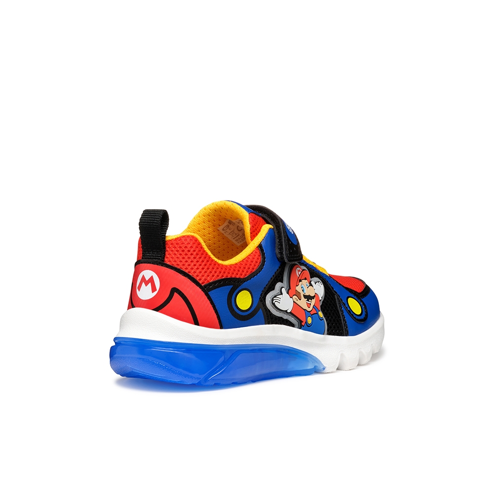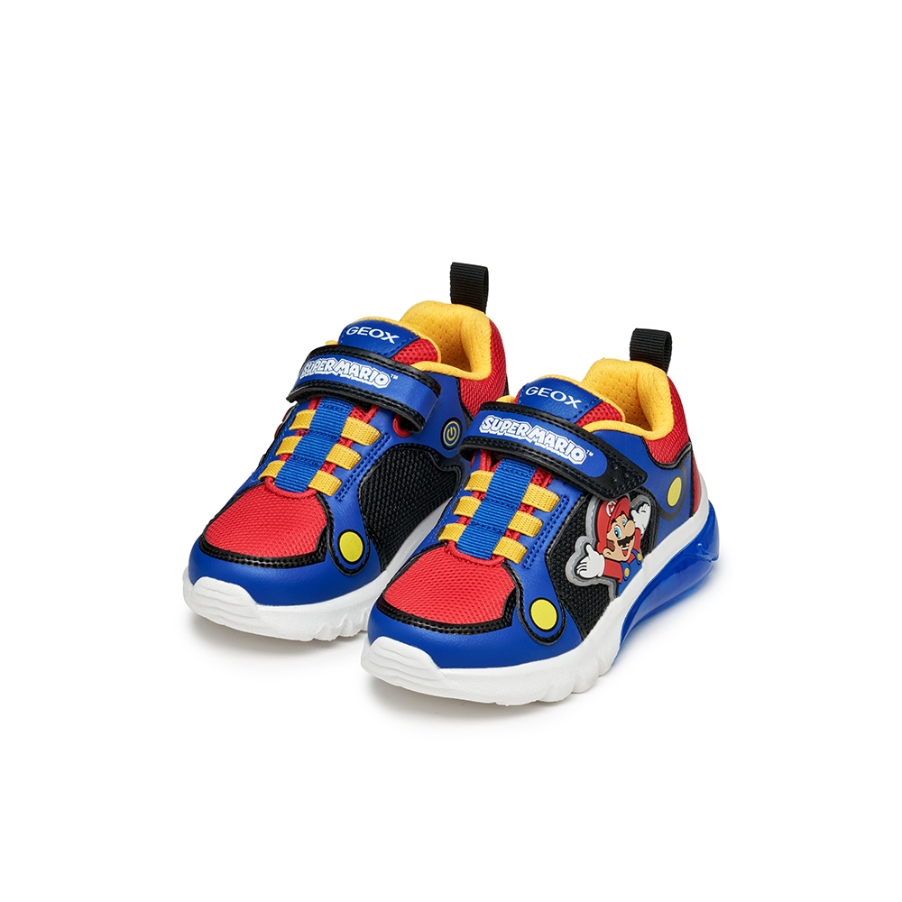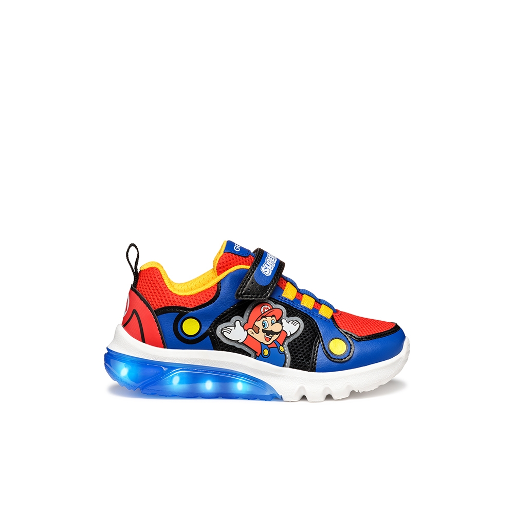 Zapatillas deportiva para niño amortiguada y transpirable de look dinámico, con luces integradas en la suela. Esta versión de Ciberdron en color azul royal y rojo tiene una decoradación con estampados y aplicaciones 3D. Este modelo, fruto de la colaboración entre Geox y Nintendo, ha sido realizado con malla y material efecto piel y resulta ideal para completar los looks de la escuela y del tiempo libre.