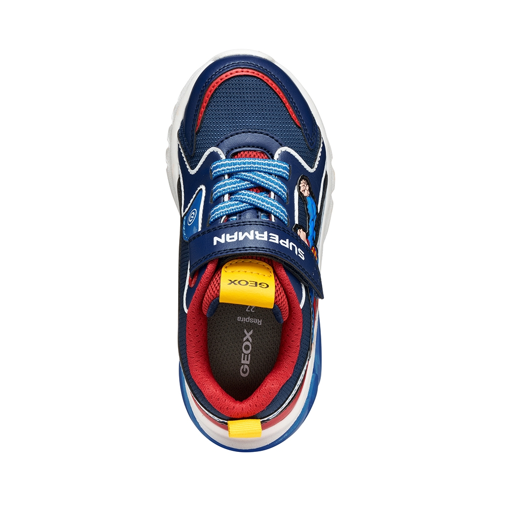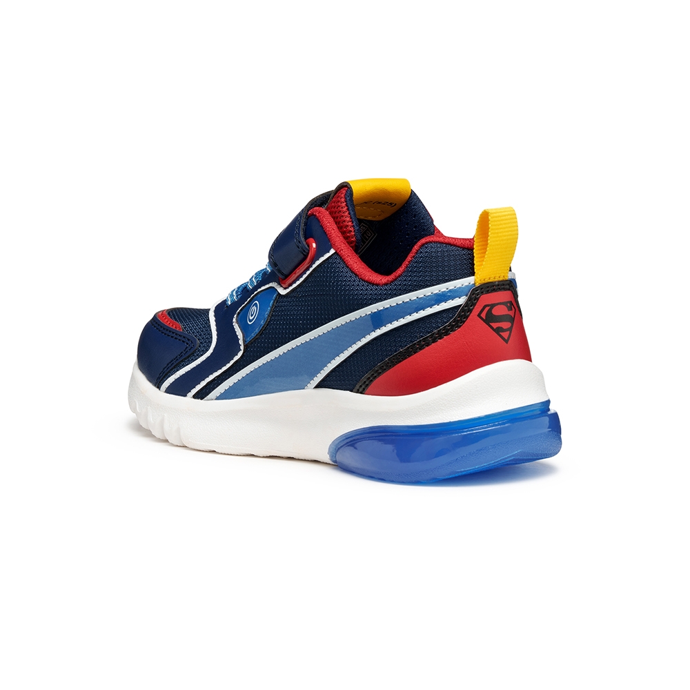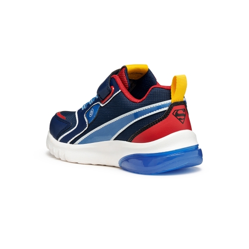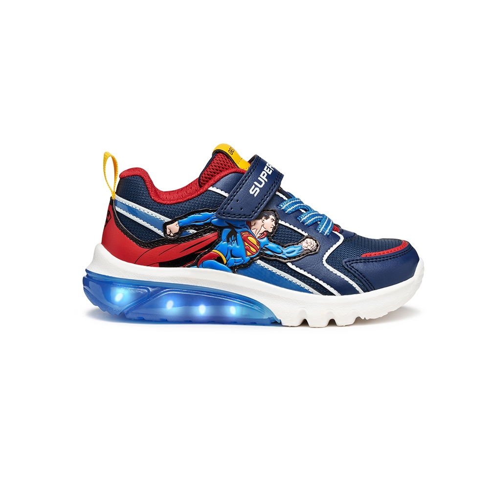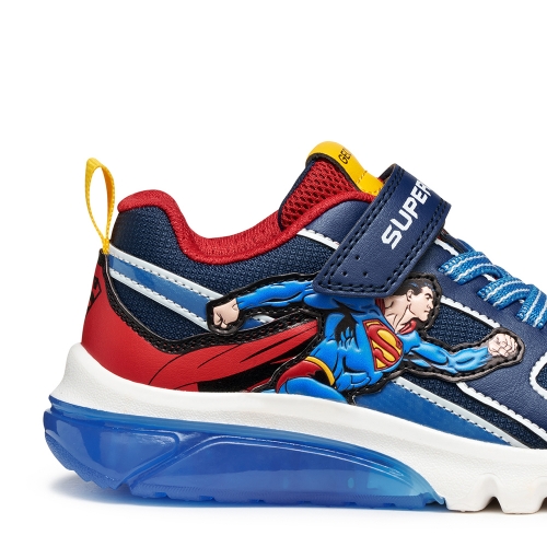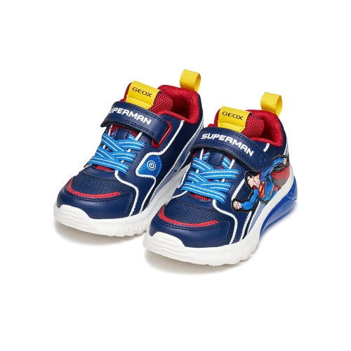 Zapatilla deportiva para niño de look activo y moderno, fruto de la colaboración entre Geox y Warner Bros e inspirada en el superhéroe Superman. Esta versión es de color azul y rojo, fabricado en efecto piel y tejido con detalles que recuerdan al icónico personaje de cómic. Ciberdron cuenta con luces integradas en la suela que añaden un toque divertido a los looks deportivos para el colegio y el tiempo libre.