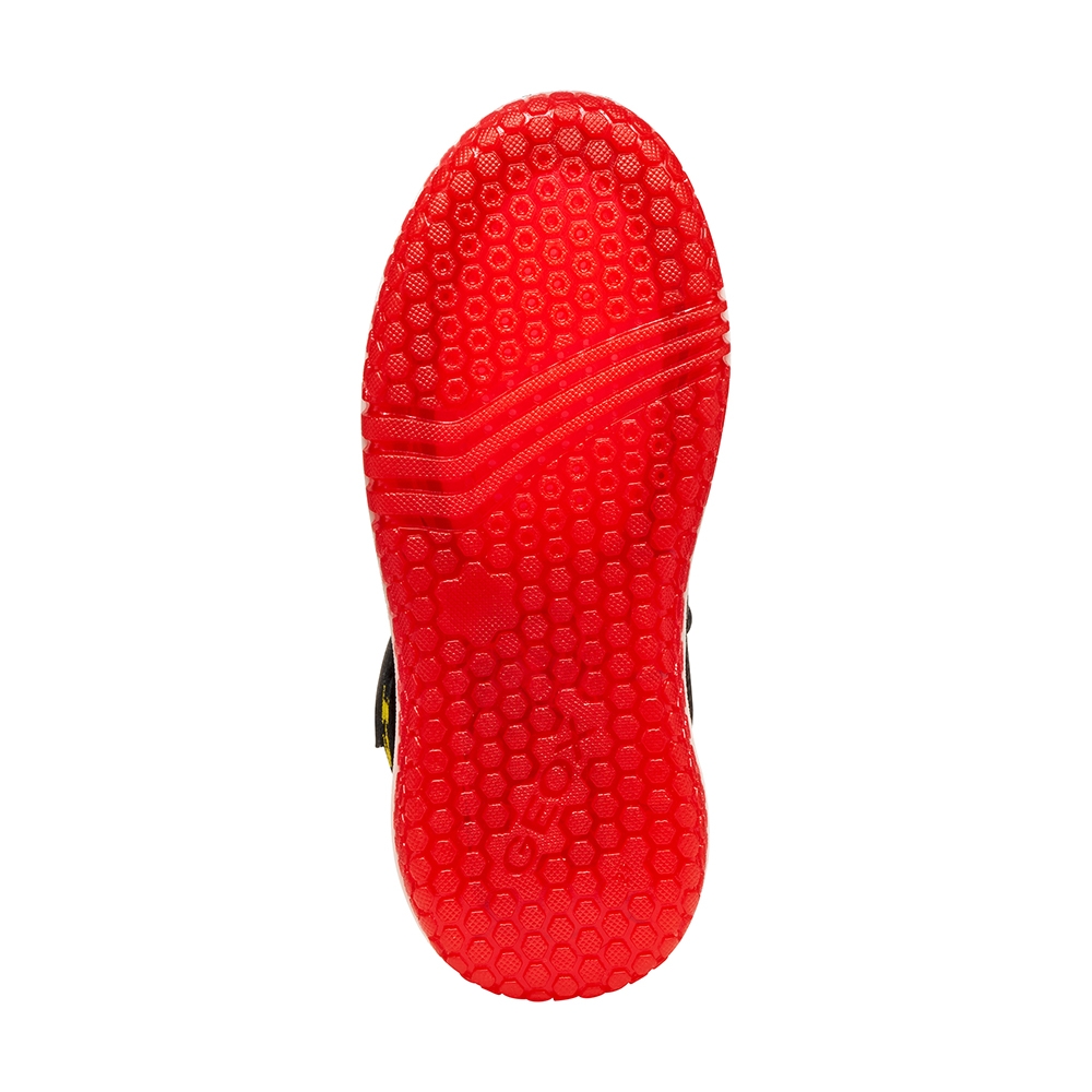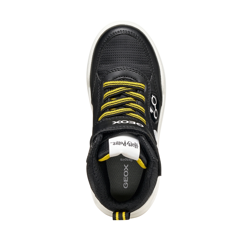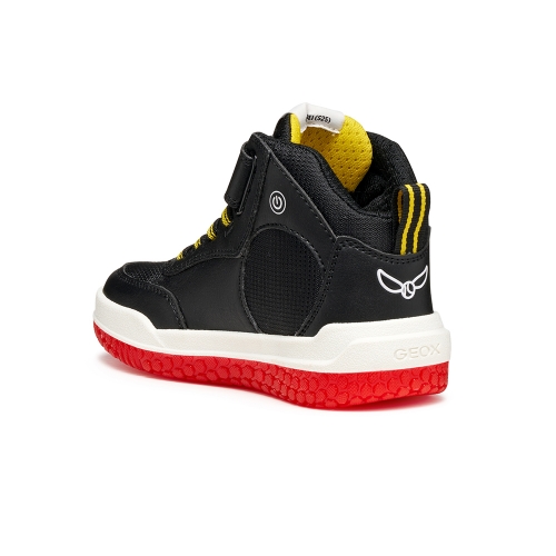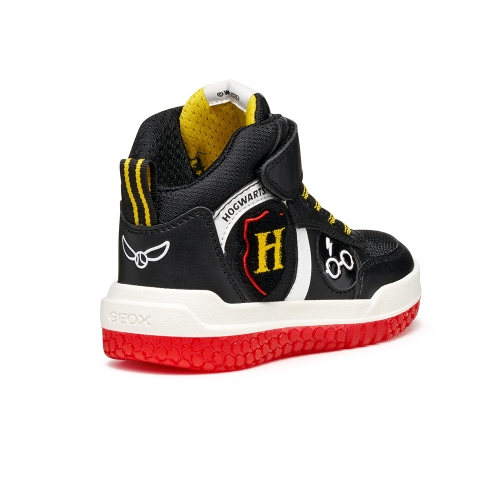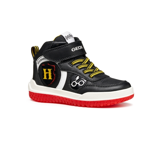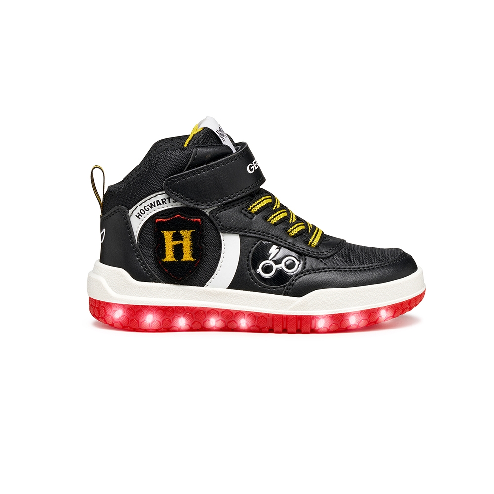 Zapatilla deportiva en forma de botín de diseño activo y moderno, fruto de la colaboración entre Geox y Warner Bros inspirada en el mágico mundo de Harry Potter. Esta versión, de color negro y rojo, ha sido fabricada con material efecto piel. Ciberdron es perfecta para la escuela o el tiempo libre, con luces integradas en la suela que añaden un toque mágico a cada paso.