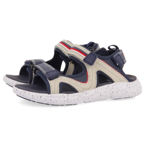 Sandalias deportivas con puntera abierta, en color gris y azul marino con detalles rojos, cierre de velcro al tobillo y en el empeine, un básico que no podrá faltar en tus looks mas desenfadados este verano.