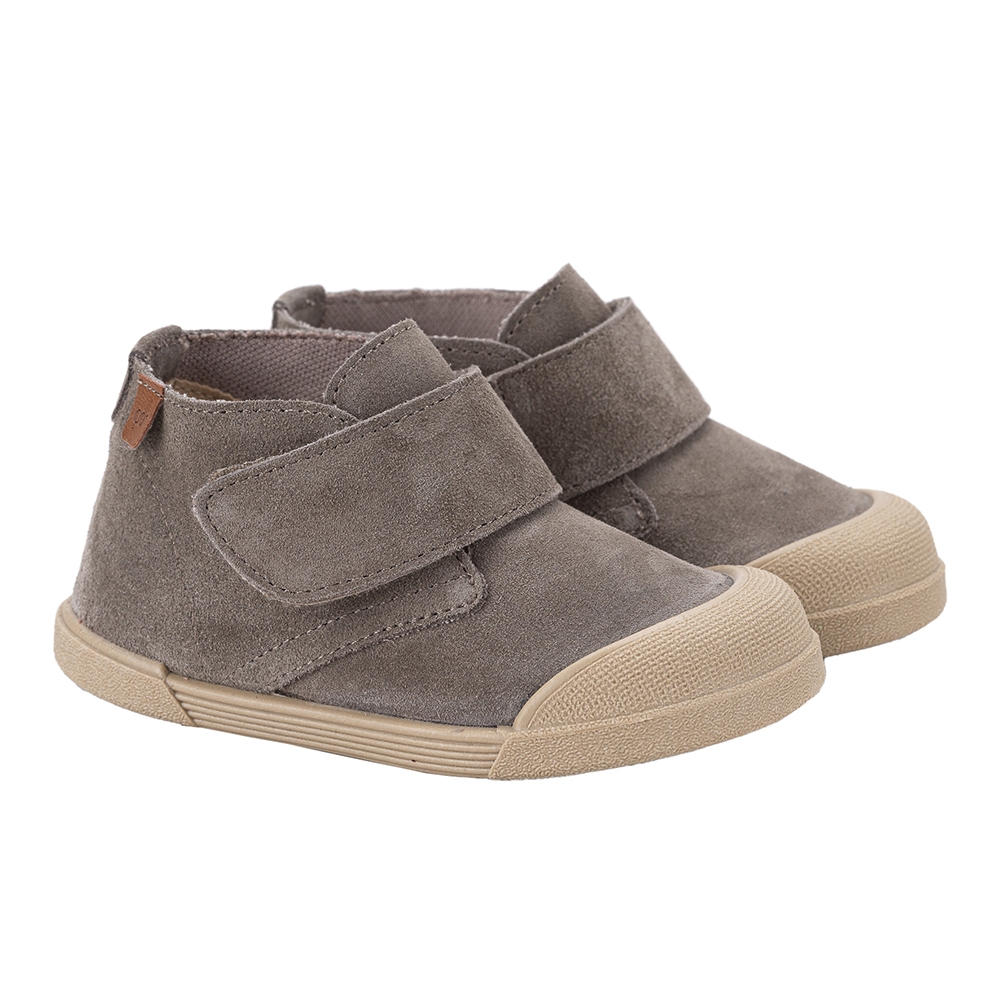 Botín de serraje de concepto barefoot, color Topo, cero drop, flexible y blandito, plantilla acolchada extraíble y cierre adherente para mayor ajuste y autonomía.