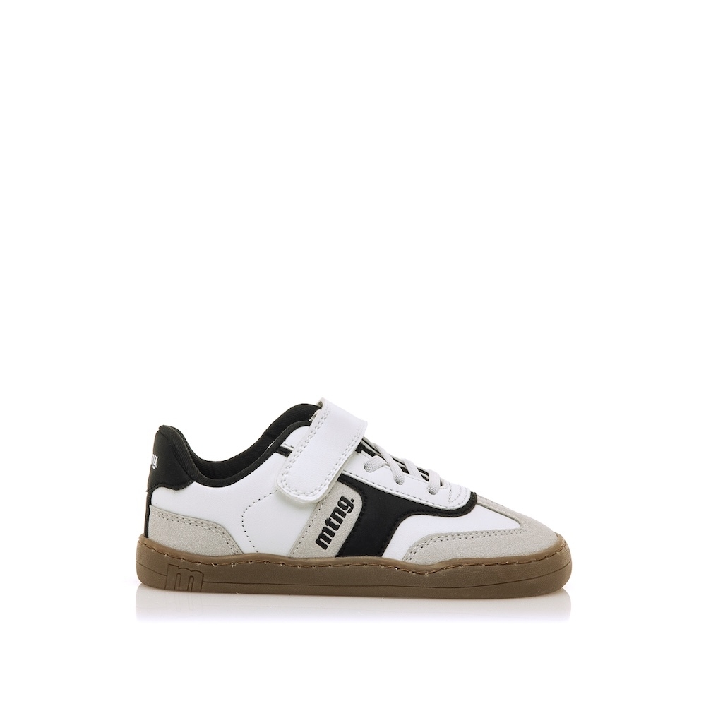 Zapatillas deportivas de color blanco para niños y niñas de la marca Mustang, modelo Free, con detalles en negro y estilo casual inspirado en las sneakers clásicas. Con cierre adherente y cordones elásticos que mejoran el ajuste y la comodidad. La suela en color caramelo contrasta con el corte superior y aporta un toque actual al diseño. Con certificado VEGANO sellado por INESCOP, el cual garantiza que no contenga fibras de origen animal.  Diseñada y desarrollada especialmente en colaboración con el Dr. Juanjo López, traumatólogo deportivo e infantil, para respetar el desarrollo natural del pie de los niños. Gracias a su puntera ancha permite el libre movimiento de los dedos dentro del zapato. Las plantillas extraíbles facilitan comprobar si la talla del calzado es la correcta y para una adecuada higiene. Además, su fácil apertura facilita que el niño pueda descalzarse y calzarse de forma autónoma.