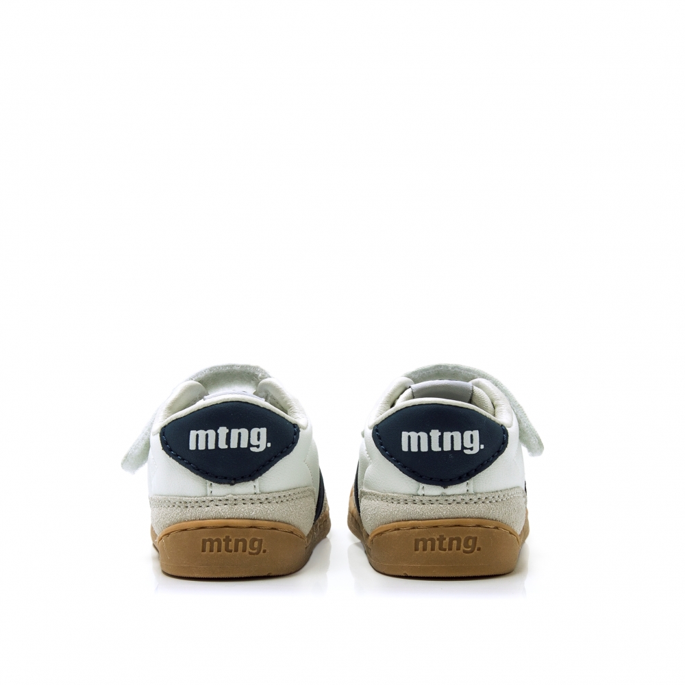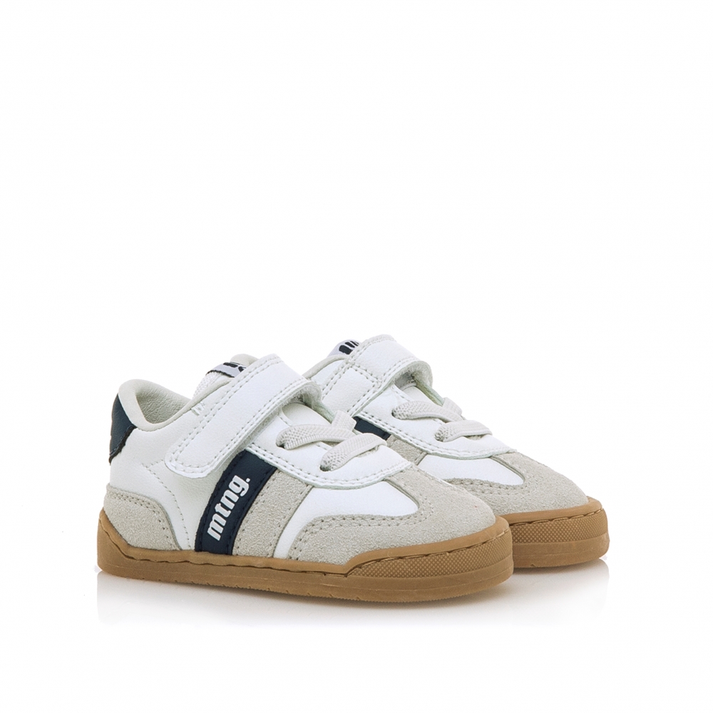 Zapatillas deportivas de color blanco para niños y niñas de la marca Mustang, modelo Free Baby, con detalles en azul marino y estilo casual inspirado en las sneakers clásicas. Con cierre adherente y cordones elásticos que mejoran el ajuste y la comodidad. La suela en color caramelo contrasta con el corte superior y aporta un toque actual al diseño. Con certificado VEGANO sellado por INESCOP, el cual garantiza que no contenga fibras de origen animal.  Diseñada y desarrollada especialmente en colaboración con el Dr. Juanjo López, traumatólogo deportivo e infantil, para respetar el desarrollo natural del pie de los niños. Gracias a su puntera ancha permite el libre movimiento de los dedos dentro del zapato. Su suela tiene 3 mm de grosor y con zero drop (totalmente plana) respeta el natural desarrollo del pie del pequeño y sus elementos flexibles y torsionables hace que el pie del niño no esté encorsetado por la estructura del zapato. Las plantillas extraíbles facilitan comprobar si la talla del calzado es la correcta y para una adecuada higiene. Además, su fácil apertura facilita que el niño pueda descalzarse y calzarse de forma autónoma.