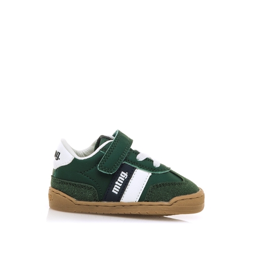 Zapatillas deportivas de color verde  para niños y niñas de la marca Mustang, modelo Free Baby, con detalles en blanco y estilo casual inspirado en las sneakers clásicas. Con cierre adherente y cordones elásticos que mejoran el ajuste y la comodidad. La suela en color caramelo contrasta con el corte superior y aporta un toque actual al diseño. Con certificado VEGANO sellado por INESCOP, el cual garantiza que no contenga fibras de origen animal.  Diseñada y desarrollada especialmente en colaboración con el Dr. Juanjo López, traumatólogo deportivo e infantil, para respetar el desarrollo natural del pie de los niños. Gracias a su puntera ancha permite el libre movimiento de los dedos dentro del zapato. Su suela tiene 3 mm de grosor y con zero drop (totalmente plana) respeta el natural desarrollo del pie del pequeño y sus elementos flexibles y torsionables hace que el pie del niño no esté encorsetado por la estructura del zapato. Las plantillas extraíbles facilitan comprobar si la talla del calzado es la correcta y para una adecuada higiene. Además, su fácil apertura facilita que el niño pueda descalzarse y calzarse de forma autónoma.