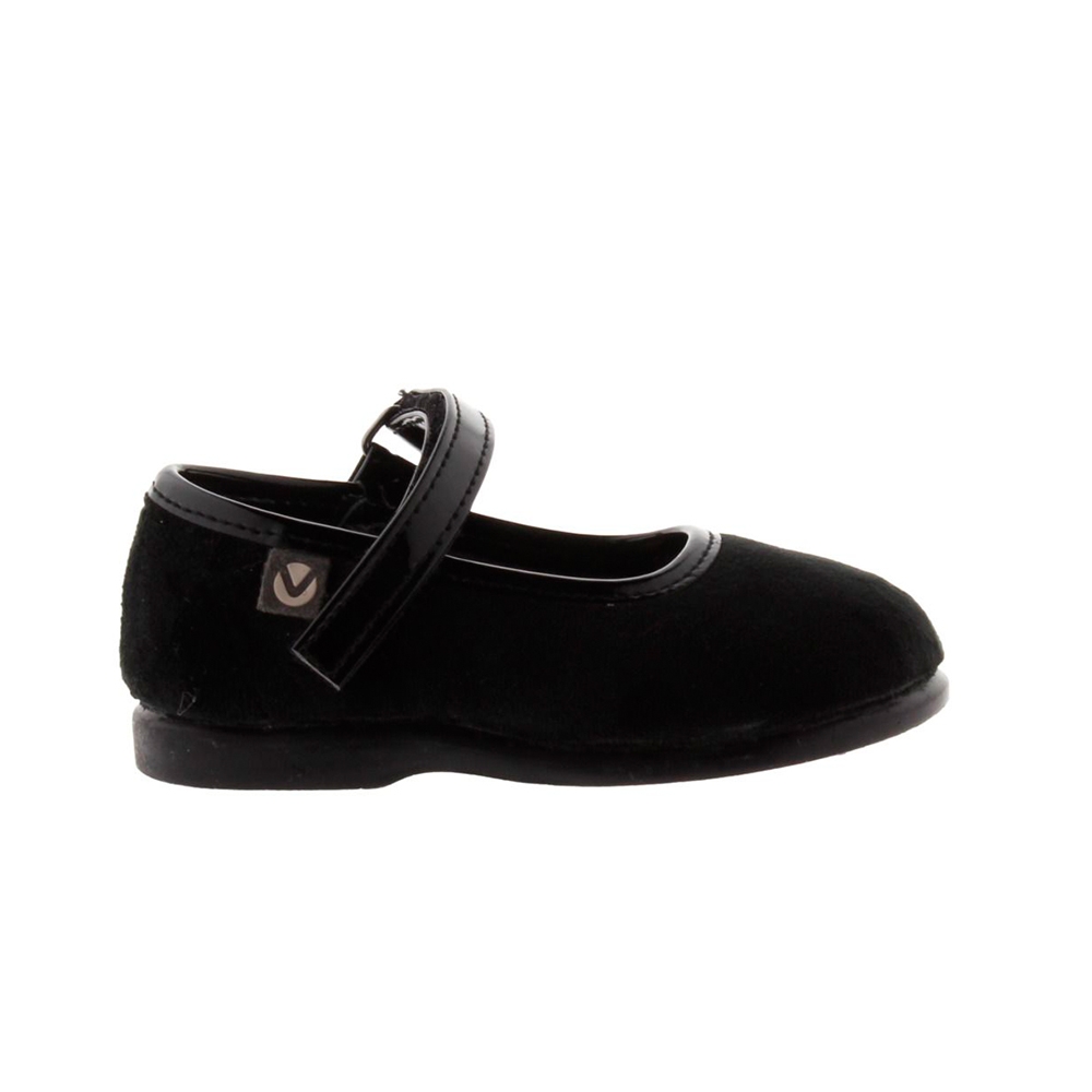 Mercedes de terciopelo para niña con detalles en charol y cierre de velcro que facilita el calce y fomenta la autonomía de las pequeñas. Disponible en varios colores.