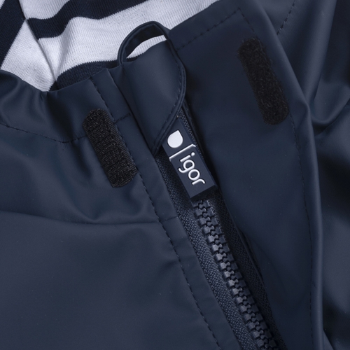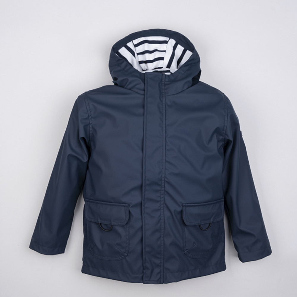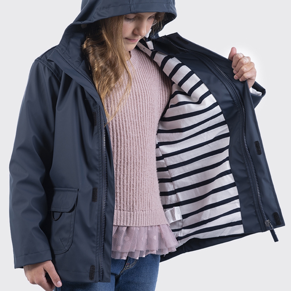 Chubasquero clásico en color azul marino, impermeable con bolsillos frontales, solapa y forro interior de algodón a rayas. - Lavar a máquina del revés. - Utilizar agua fría y un programa para prendas delicadas con centrifugado suave. - No usar secadora.