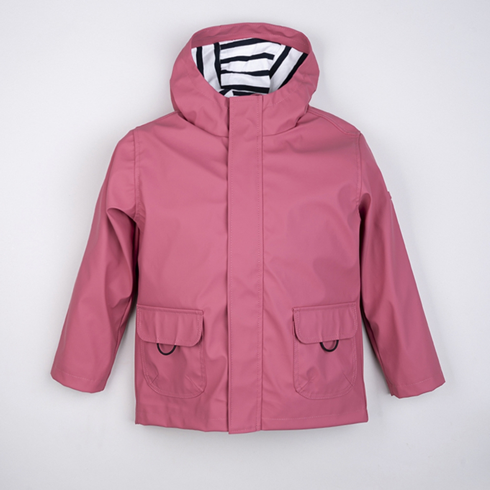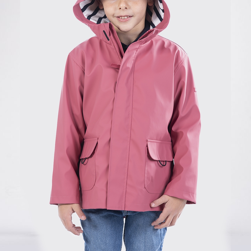 Chubasquero clásico en color franbuesa marino, impermeable con bolsillos frontales, solapa y forro interior de algodón a rayas. - Lavar a máquina del revés. - Utilizar agua fría y un programa para prendas delicadas con centrifugado suave. - No usar secadora.