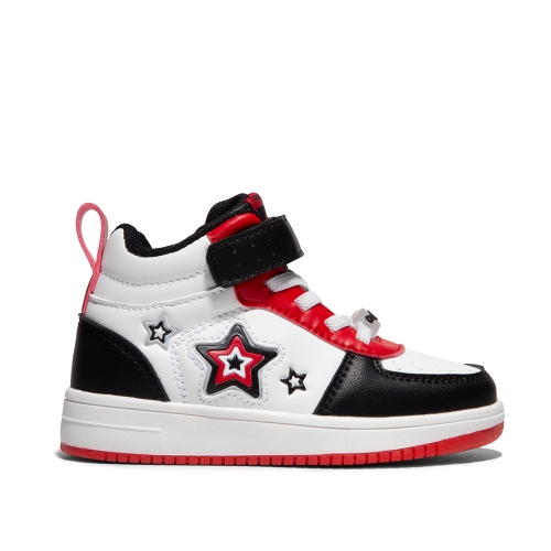 Zapatillas altas en colores negro, rojo y blanco con detalles de estrellas con luz en el lateral. La gran estrella ubicada en el lateral del zapato se ilumina al ritmo de sus pasos.