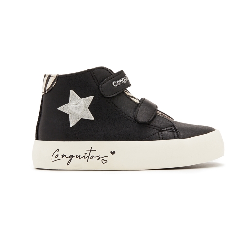 Las Zapatillas Altas con Estrella de Conguitos son el calzado ideal para las niñas que buscan un estilo moderno y enérgico. Su diseño es negro y estrellas bordadas.