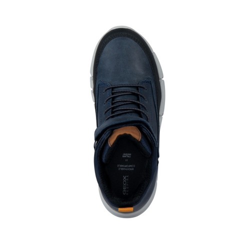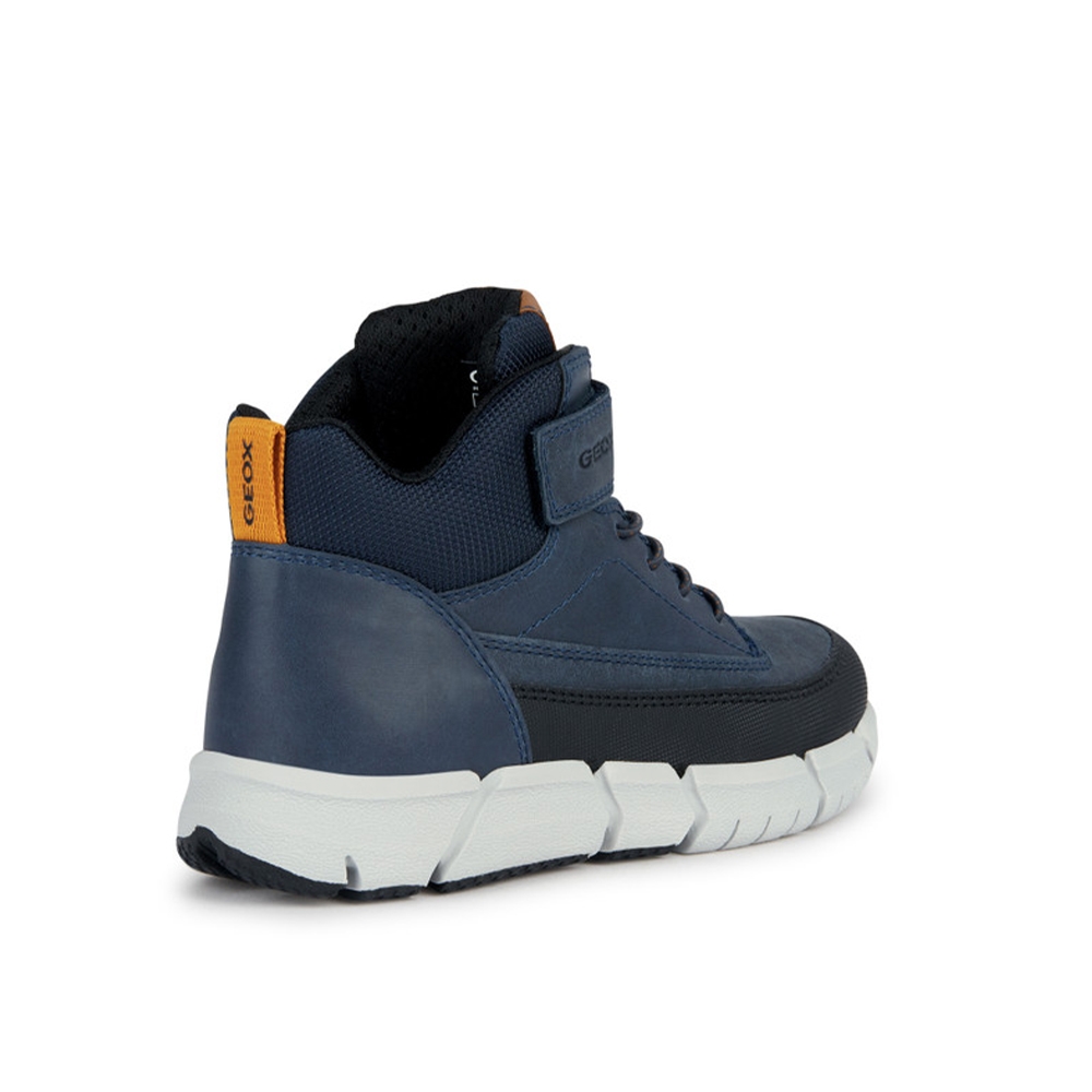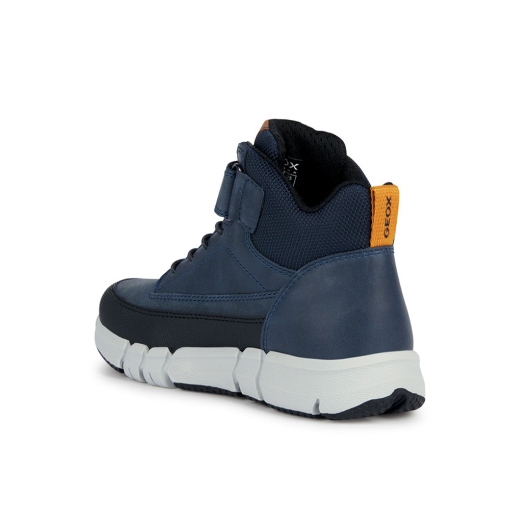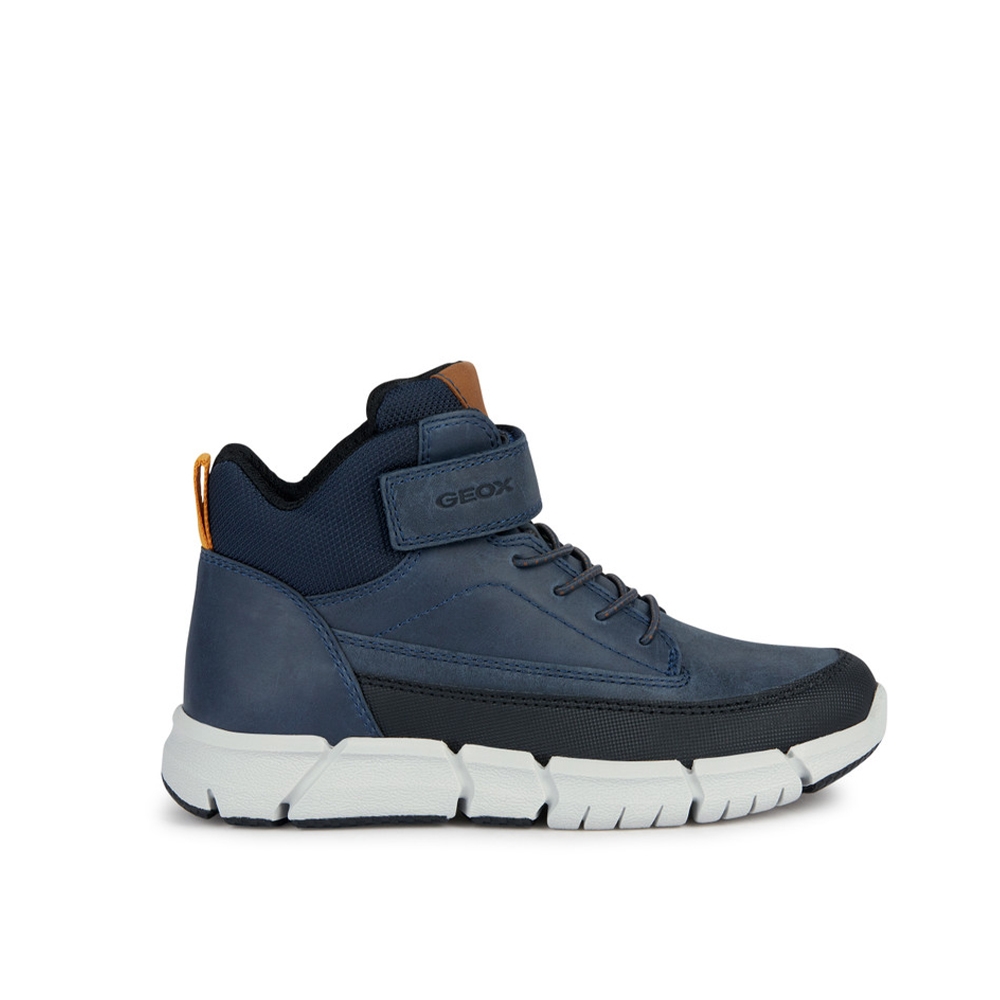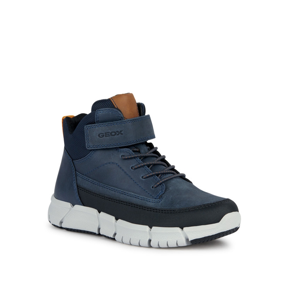 Botín de niño, deportivo y de atractivo outdoor, protector y transpirable. Fabricado en color azul y negro, Flexyper Plus cuenta con una suela especial ultra adherente que garantiza un agarre excelente en todas las superficies. Este modelo, de material efecto piel encerada y nailon, es flexible y amortiguado ideal para combinar con todos sus looks, y además es muy confortable.