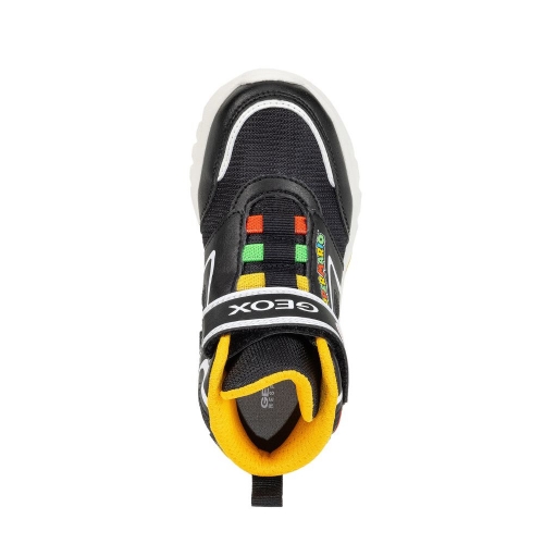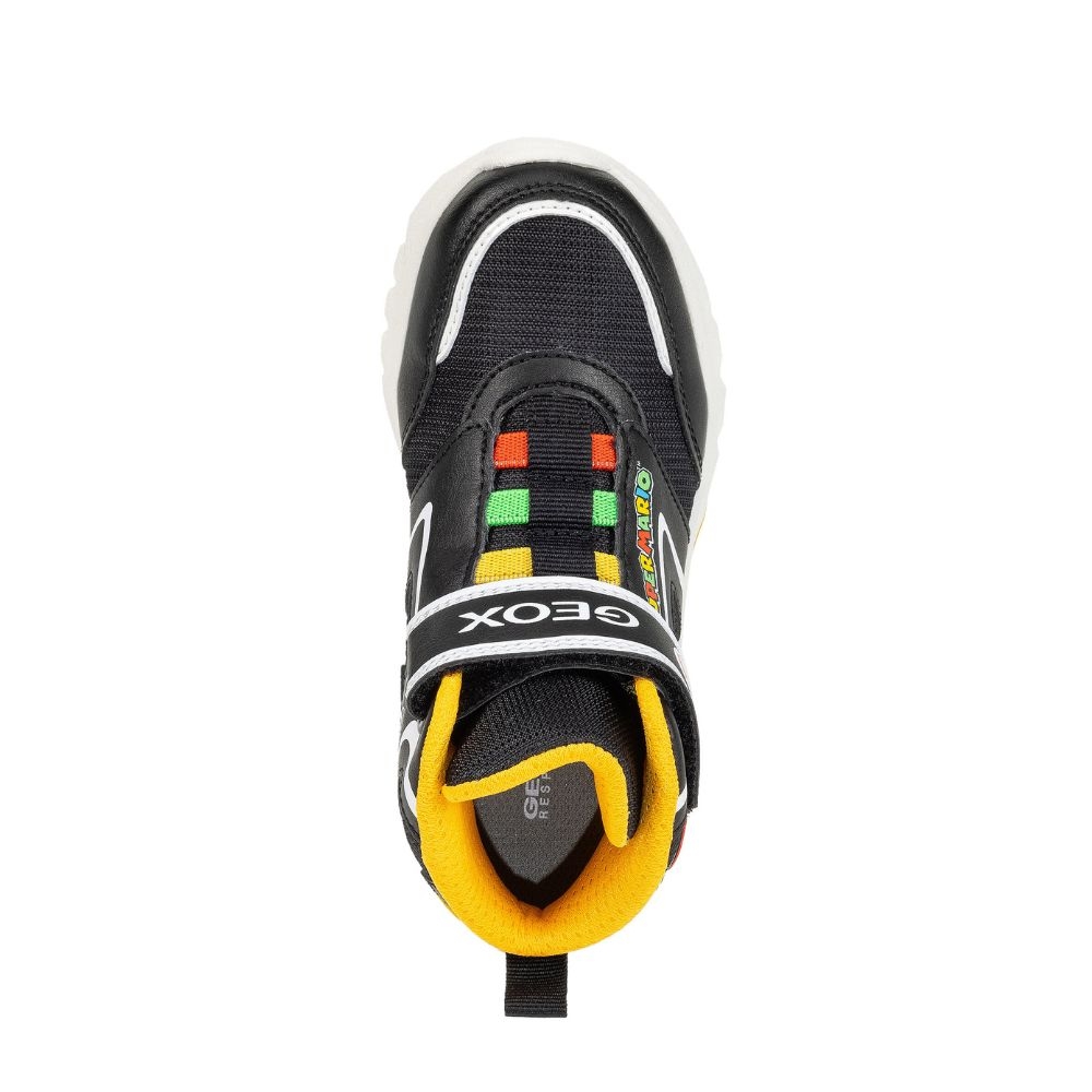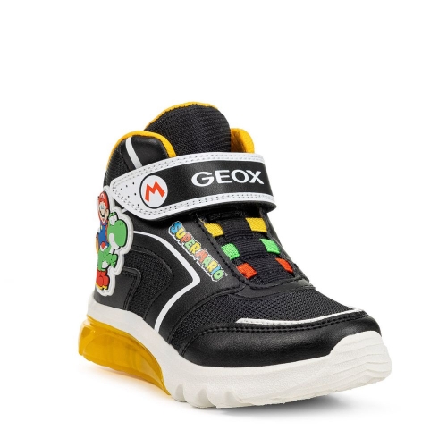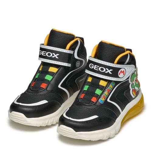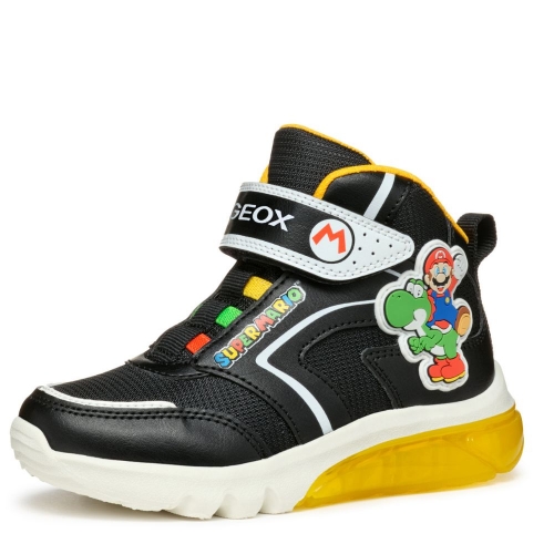 Botín Deportivo transpirable para niños, fruto de la colaboración de GEOX Y NINTENDO, en los laterales tiene al emblemático personaje de videojuegos SUPER MARIO, con cierre adherente, transpirable, con luces en la suela y botón de apagado/encendido, piso antideslizante, ligera y durable. Plantilla extraíble y anti-bacterias. Ideales para todos tus looks y lo que mas les gustara a nuestros peques.