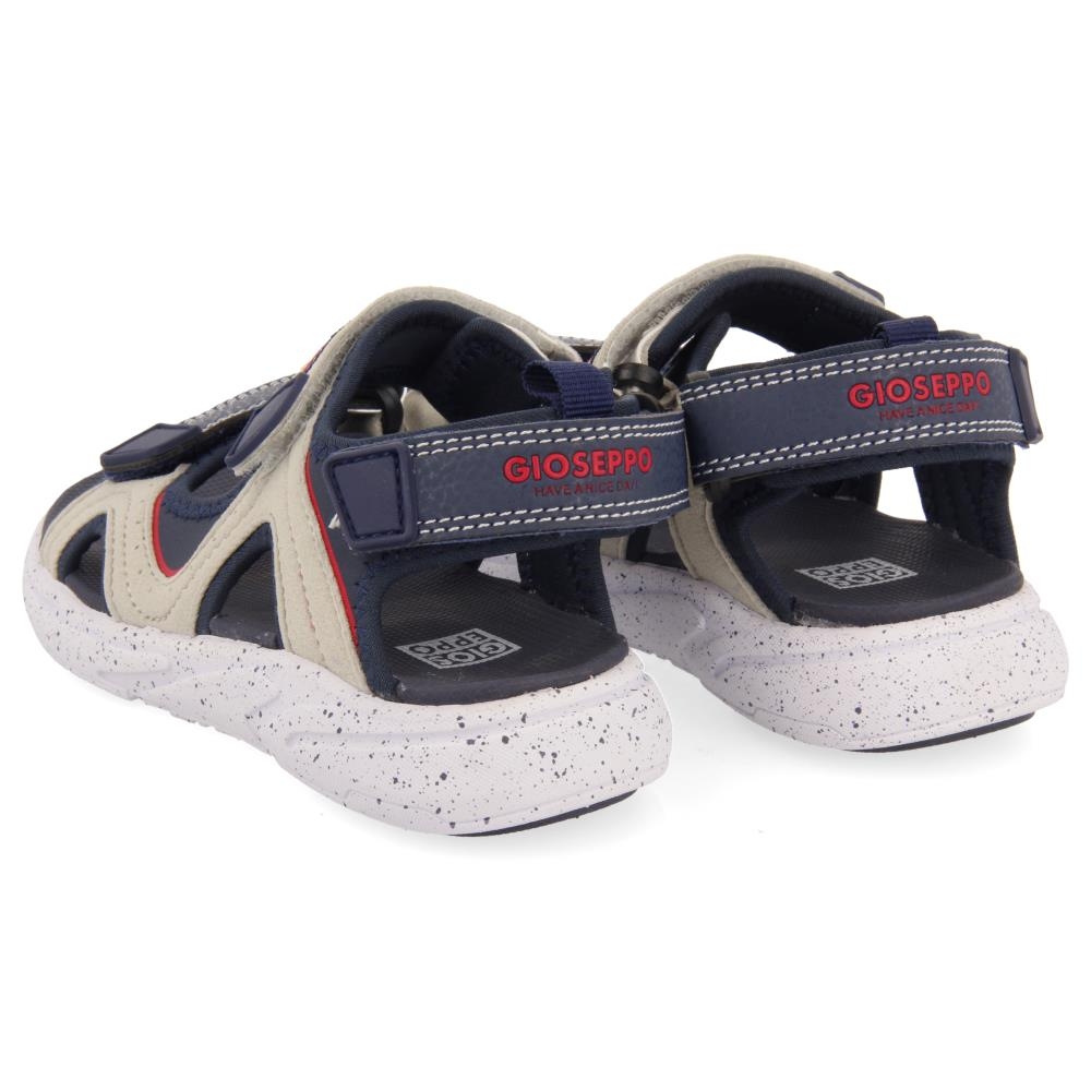 Sandalias deportivas con puntera abierta, en color gris y azul marino con detalles rojos, cierre de velcro al tobillo y en el empeine, un básico que no podrá faltar en tus looks mas desenfadados este verano.