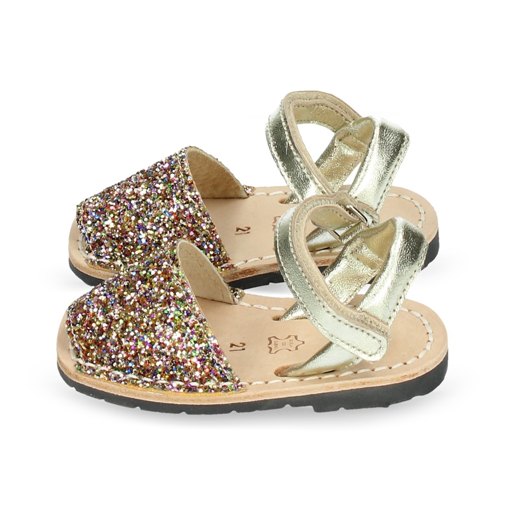 Estas Avarcas menorquinas están diseñadas para que las más pequeñas disfruten a lo grande. Gracias a los materiales neumáticos de la suela que aportan libertad y confort en cada pisada. Su cierre de velcro permite regular la medida para ajustarse suavemente al pie. El glitter multicolor  de la pala les da un toque ideal para que lo luzcan las más presumidas. Un zapato con personalidad y estilo.