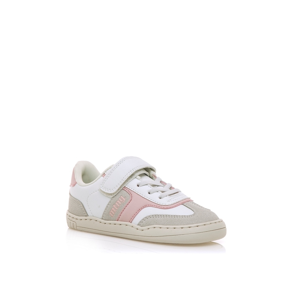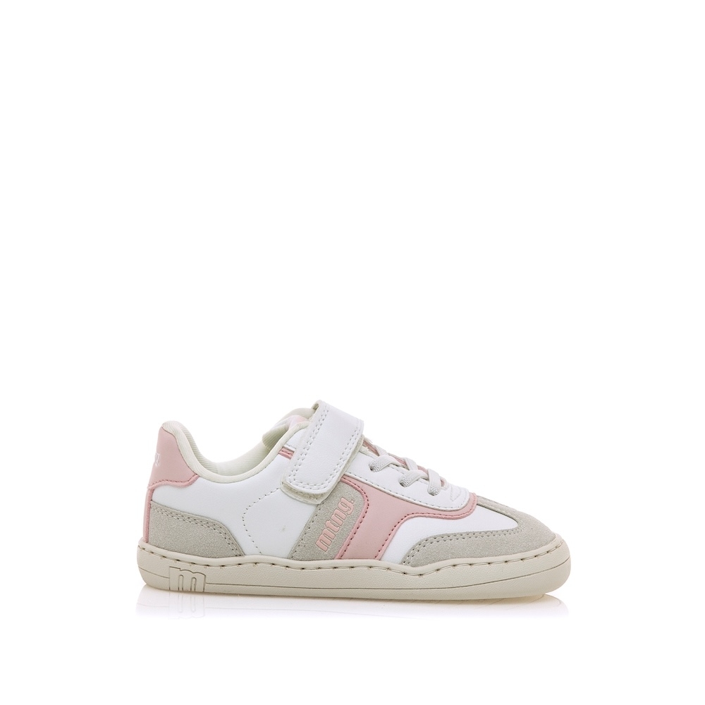 Zapatillas deportivas de color blanco para niños y niñas de la marca Mustang, modelo Free, con detalles en rosa y estilo casual inspirado en las sneakers clásicas. Con cierre adherente y cordones elásticos que mejoran el ajuste y la comodidad. La suela en color caramelo contrasta con el corte superior y aporta un toque actual al diseño. Con certificado VEGANO sellado por INESCOP, el cual garantiza que no contenga fibras de origen animal.  Diseñada y desarrollada especialmente en colaboración con el Dr. Juanjo López, traumatólogo deportivo e infantil, para respetar el desarrollo natural del pie de los niños. Gracias a su puntera ancha permite el libre movimiento de los dedos dentro del zapato. Las plantillas extraíbles facilitan comprobar si la talla del calzado es la correcta y para una adecuada higiene. Además, su fácil apertura facilita que el niño pueda descalzarse y calzarse de forma autónoma.