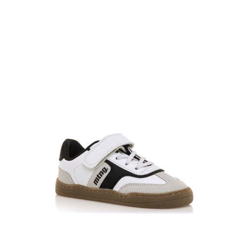 Zapatillas deportivas de color blanco para niños y niñas de la marca Mustang, modelo Free, con detalles en negro y estilo casual inspirado en las sneakers clásicas. Con cierre adherente y cordones elásticos que mejoran el ajuste y la comodidad. La suela en color caramelo contrasta con el corte superior y aporta un toque actual al diseño. Con certificado VEGANO sellado por INESCOP, el cual garantiza que no contenga fibras de origen animal.  Diseñada y desarrollada especialmente en colaboración con el Dr. Juanjo López, traumatólogo deportivo e infantil, para respetar el desarrollo natural del pie de los niños. Gracias a su puntera ancha permite el libre movimiento de los dedos dentro del zapato. Las plantillas extraíbles facilitan comprobar si la talla del calzado es la correcta y para una adecuada higiene. Además, su fácil apertura facilita que el niño pueda descalzarse y calzarse de forma autónoma.