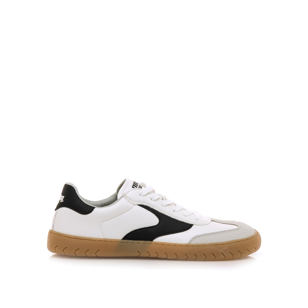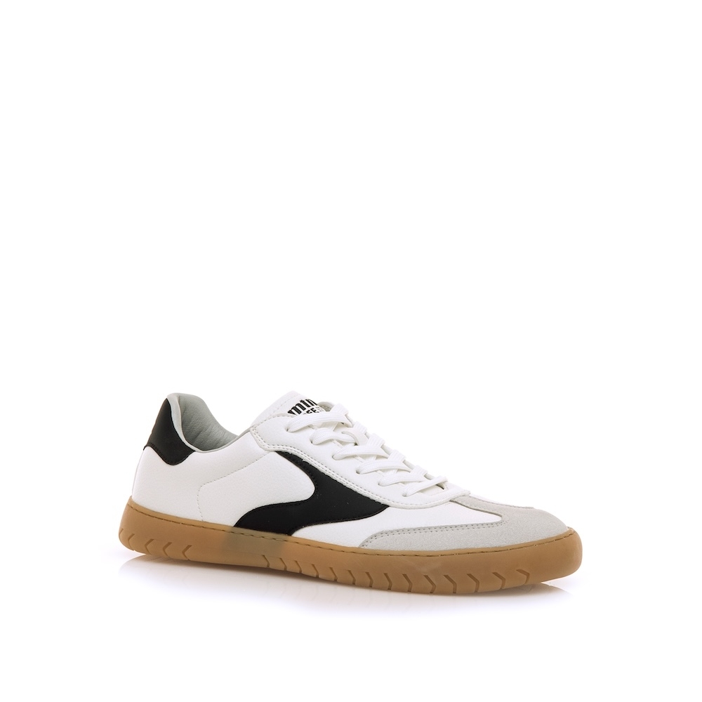 Zapatillas BAREFOOT de color blanco para hombre, modelo Free Jym de Mustang. Combina el color blanco con detalles negros en los laterales y talón, y un refuerzo en la puntera en tono gris claro. La suela marrón de acabado texturizado aporta un toque vintage a este diseño de inspiración retro. Diseñadas y desarrolladas especialmente en colaboración con el Dr. Juanjo López, traumatólogo deportivo, para respetar el desarrollo natural del pie. Es un calzado minimalista que gracias a su puntera ancha, suela totalmente plana (cero drop) y flexibilidad, mejora la anatomía del pie y favorece una mejor posición del mismo. Se vende con una plantilla de transición para hacer el cambio de calzado convencional a minimalista de manera progresiva. Con certificado VEGANO sellado por INESCOP, el cual garantiza que no contenga fibras de origen animal.