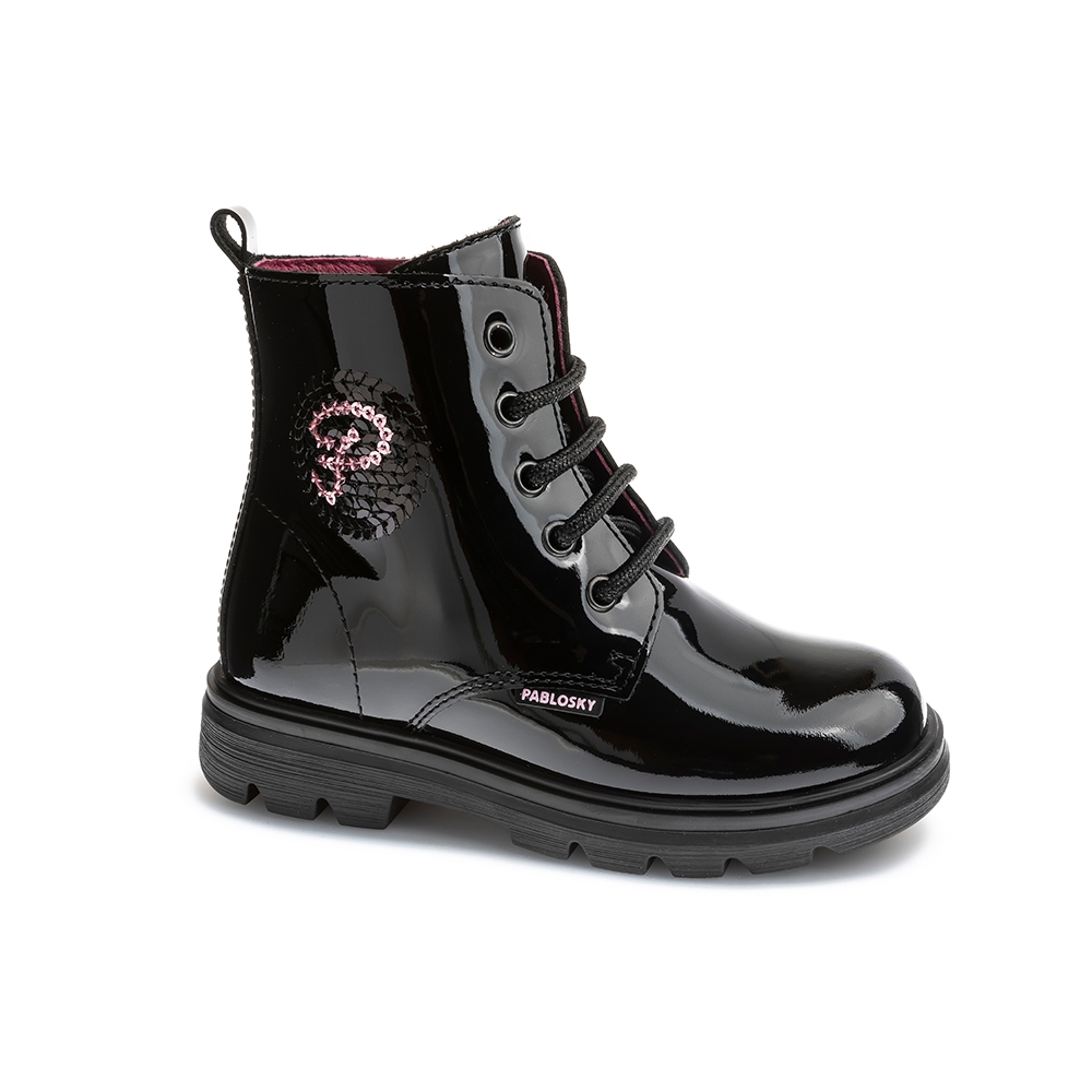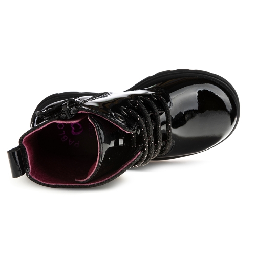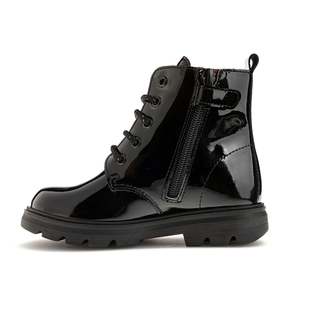 Bota estilo militar para niña en color negro con efecto charol, cierre de cremallera y cordones, super calentitas y cómodas. COMBINAN CON TODO!!