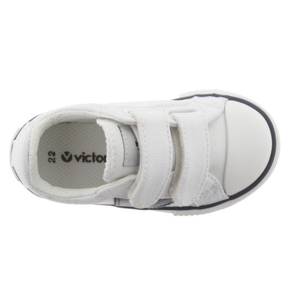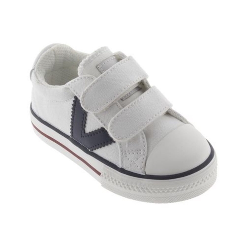 Zapatillas deportivas de lona para niños con puntera de goma. Cierre de velcro para mayor autonomía y comodidad. Con la V en el lateral en contraste.