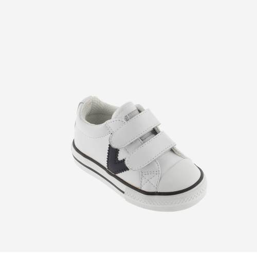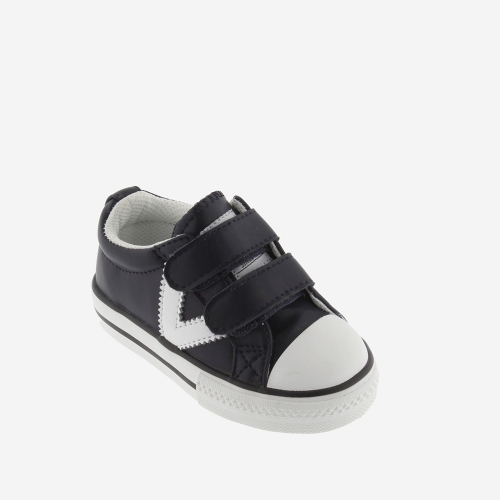 Zapatillas deportivas de piel vegana para niños con puntera de goma. Cierre de velcro para mayor autonomía y comodidad. Con la V en el lateral en contraste.